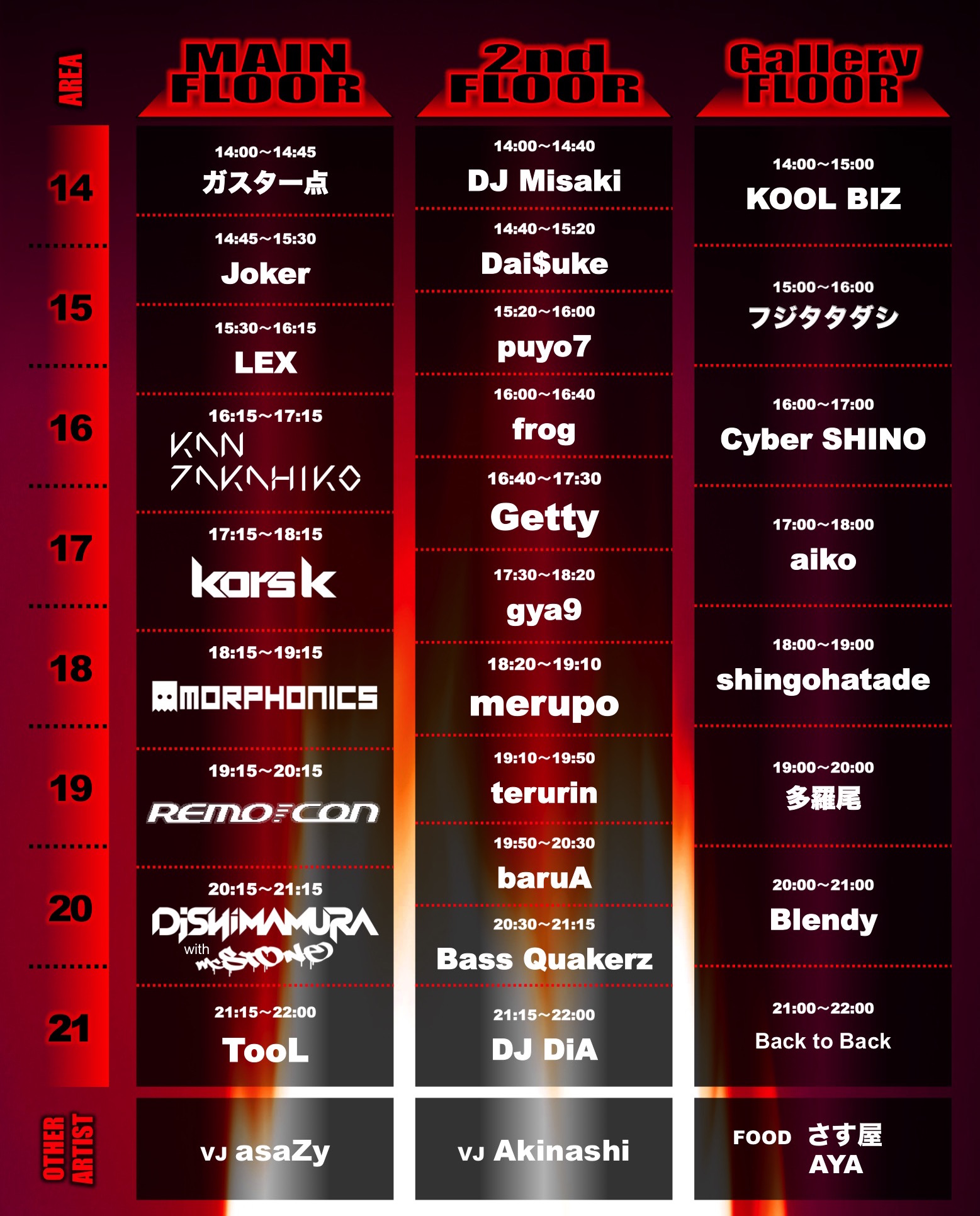 3年目となる2015年度は、HARD GROOVEはもちろん、高速RAVEサウンド・HARDCOREをフィーチャーして7月5日(日)に開催!! スペシャルゲストには、日本のHARD GROOVEシーンを牽引しながらヘッドライナーには欠かせない存在である 『REMO-CON』、国内HARDCOREシーンの初期から数多くのパーティーをコントロールし、牽引役を果たしている日本 を代表するHARDCORE RAVEアーティスト『DJ Shimamura with MC STONE』、イノベーティブなサウンドをクリエイトし続ける希代の音楽プロデューサー/DJ『kors k』、BASS MUSICから高速RAVEサウンドまでジャンルの壁を越えてソリッドなプレイでダンスフロアを支配するDJ/トラックメイカー『KAN TAKAHIKO』、国内HARD GROOVEシーンを牽引するパーティー「EXTREMA」のレジデントDJ『Morphonics a.k.a. 紙袋』が出演!!!